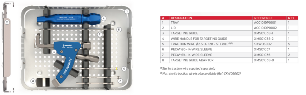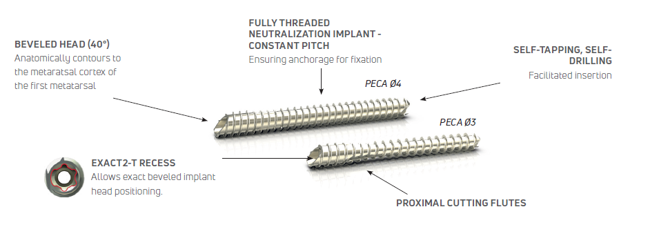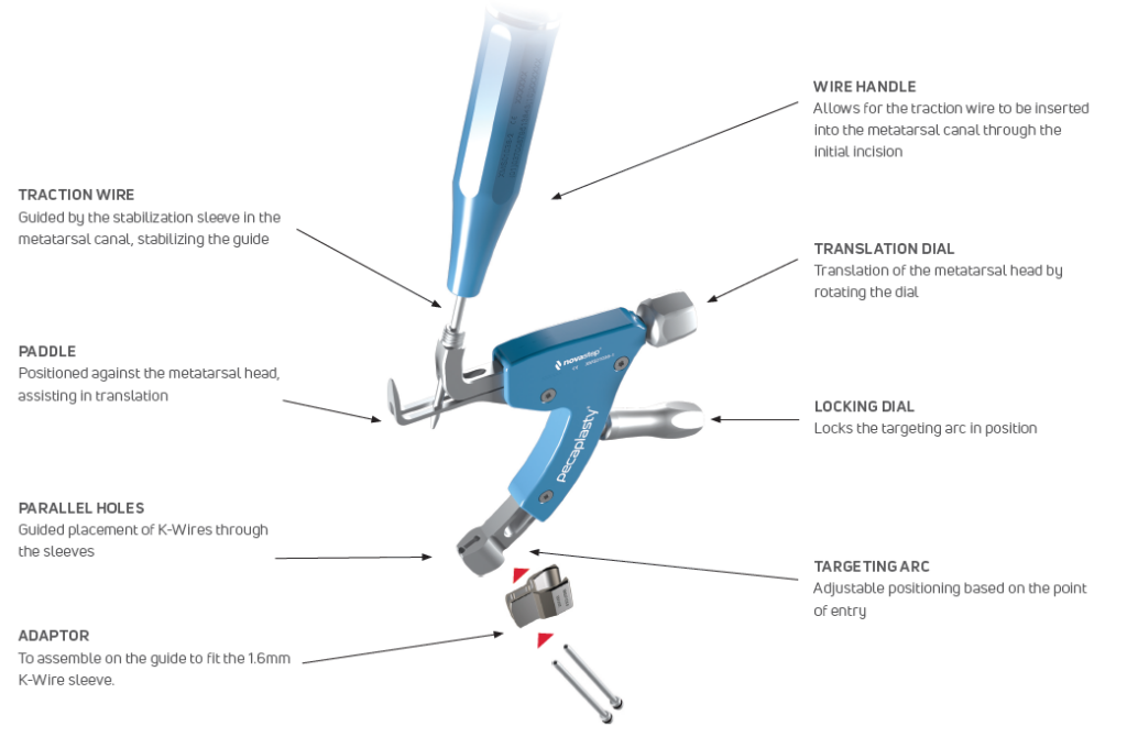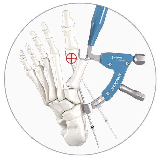 The Pecaplasty® System delivers reproducible outcomes in percutaneous bunion correction. The instrument helps navigate the challenges of the procedure by controlling translation and providing accurate placement of the K-wires. PECA® Implants are used to fasten and stabilize the correction during the healing process.