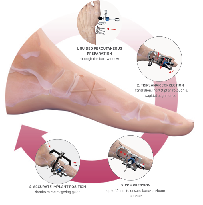 The Tarsoplasty® system allows guided and controlled Lapidus procedure for simple, precise and reproducible correction of Hallux valgus in percutaneous surgery.